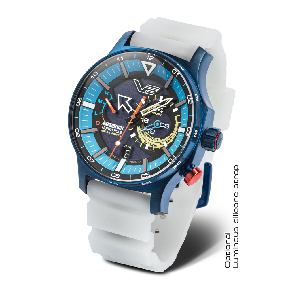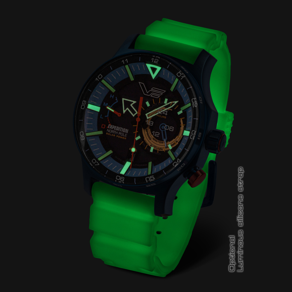 Αυτό το ρολόι Vostok-Europe Expedition Pulsometer είναι επίσης διαθέσιμο με πλήρως φωσφορίζον λουρί σιλικόνης ή με μπλε ατσάλινο bracelet με επιπλέον κόστος