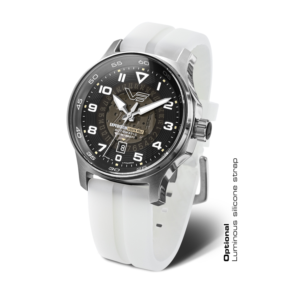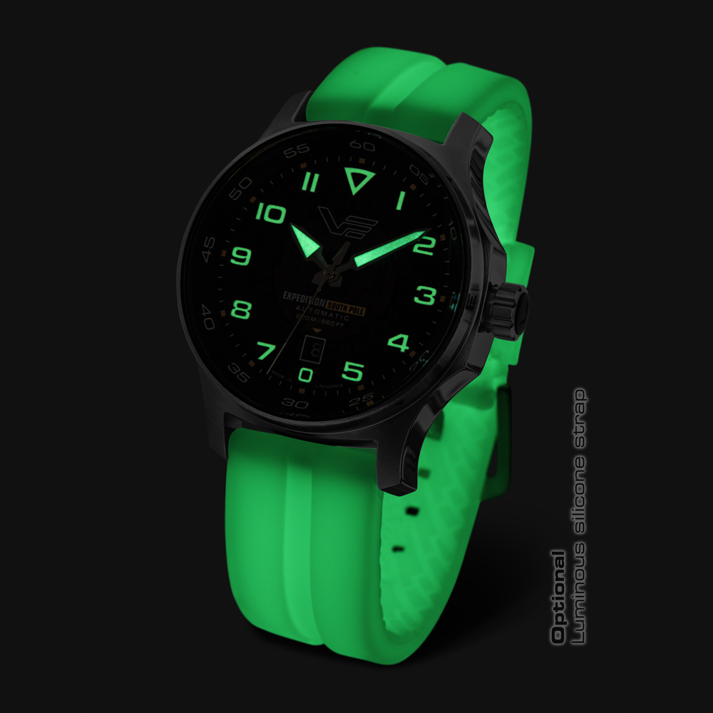 Αυτό το ρολόι Vostok-Europe Expedition South Pole Automatic είναι επίσης διαθέσιμο με ατσάλινο bracelet ή με πλήρως φωσφορίζον λουρί σιλικόνης με επιπλέον κόστος