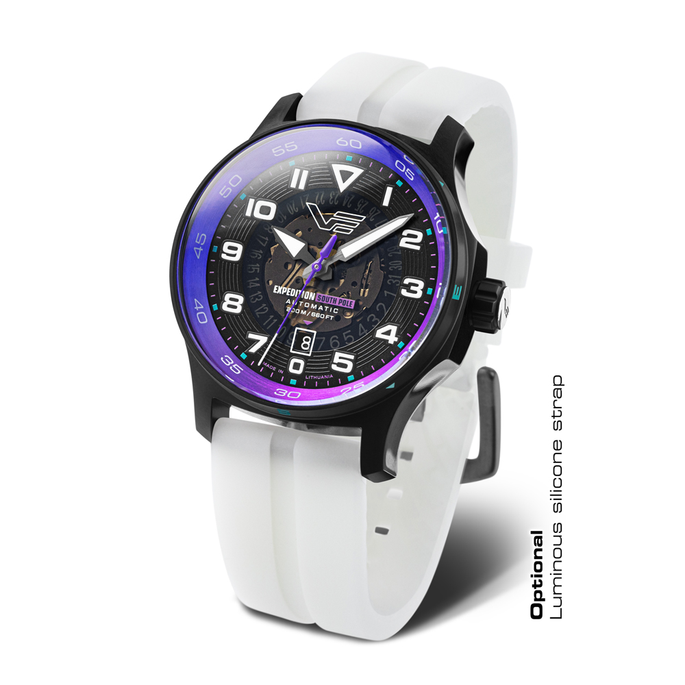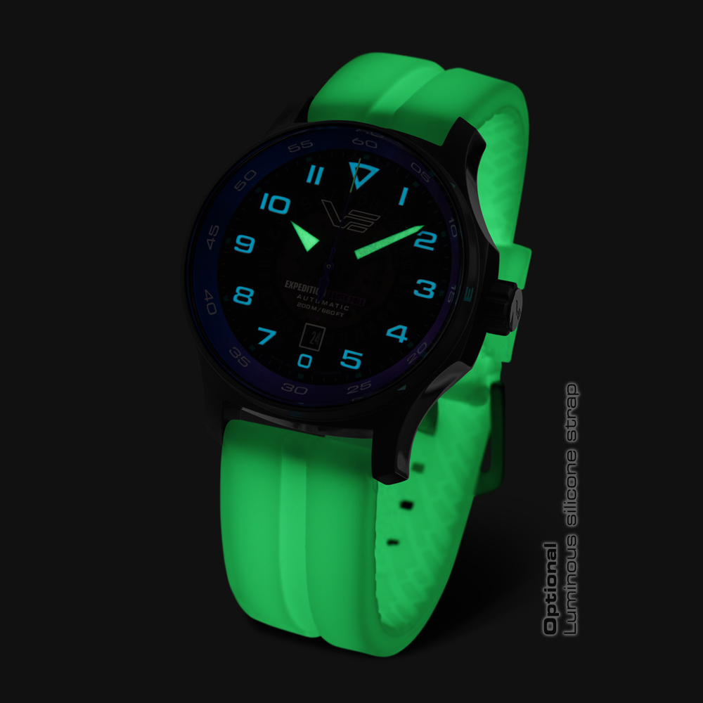 Αυτό το ρολόι Vostok-Europe Expedition South Pole Automatic είναι επίσης διαθέσιμο με μαύρο ατσάλινο bracelet ή με πλήρως φωσφορίζον λουρί σιλικόνης με επιπλέον κόστος