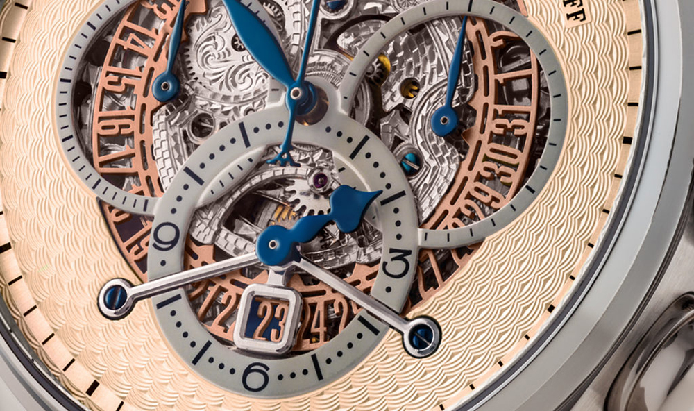 Dial: Guilloched, rose gold coloured with open center