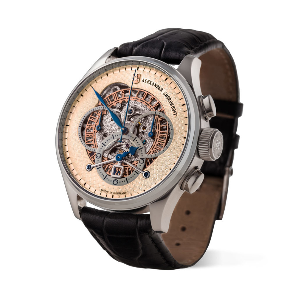 This hand winding Alexander Shorokhoff Chrono Regulator watch is also available with a stainless steel folding clasp, or a high-quality stainless steel Milanese bracelet at additional cost