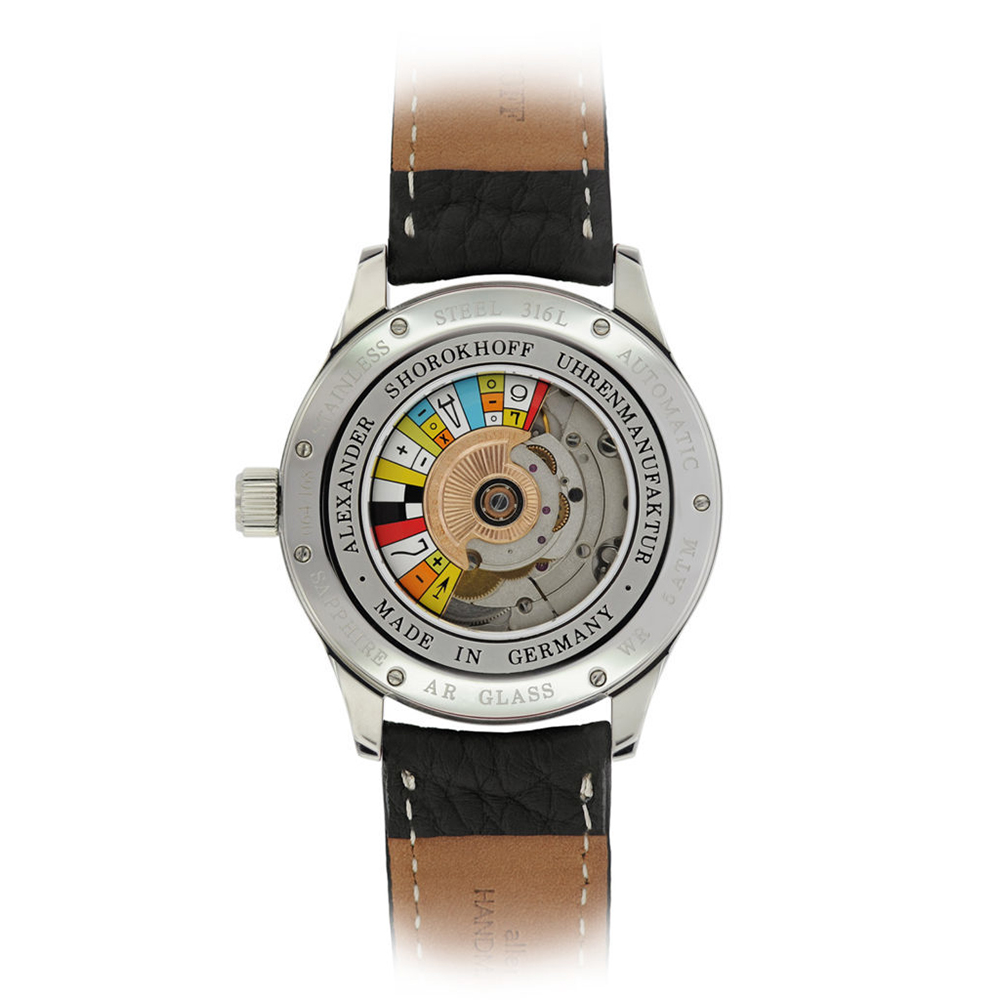 This automatic Alexander Shorokhoff Plus Minus watch is also available with a stainless steel folding clasp or a high quality stainless steel Milanese bracelet at additional cost